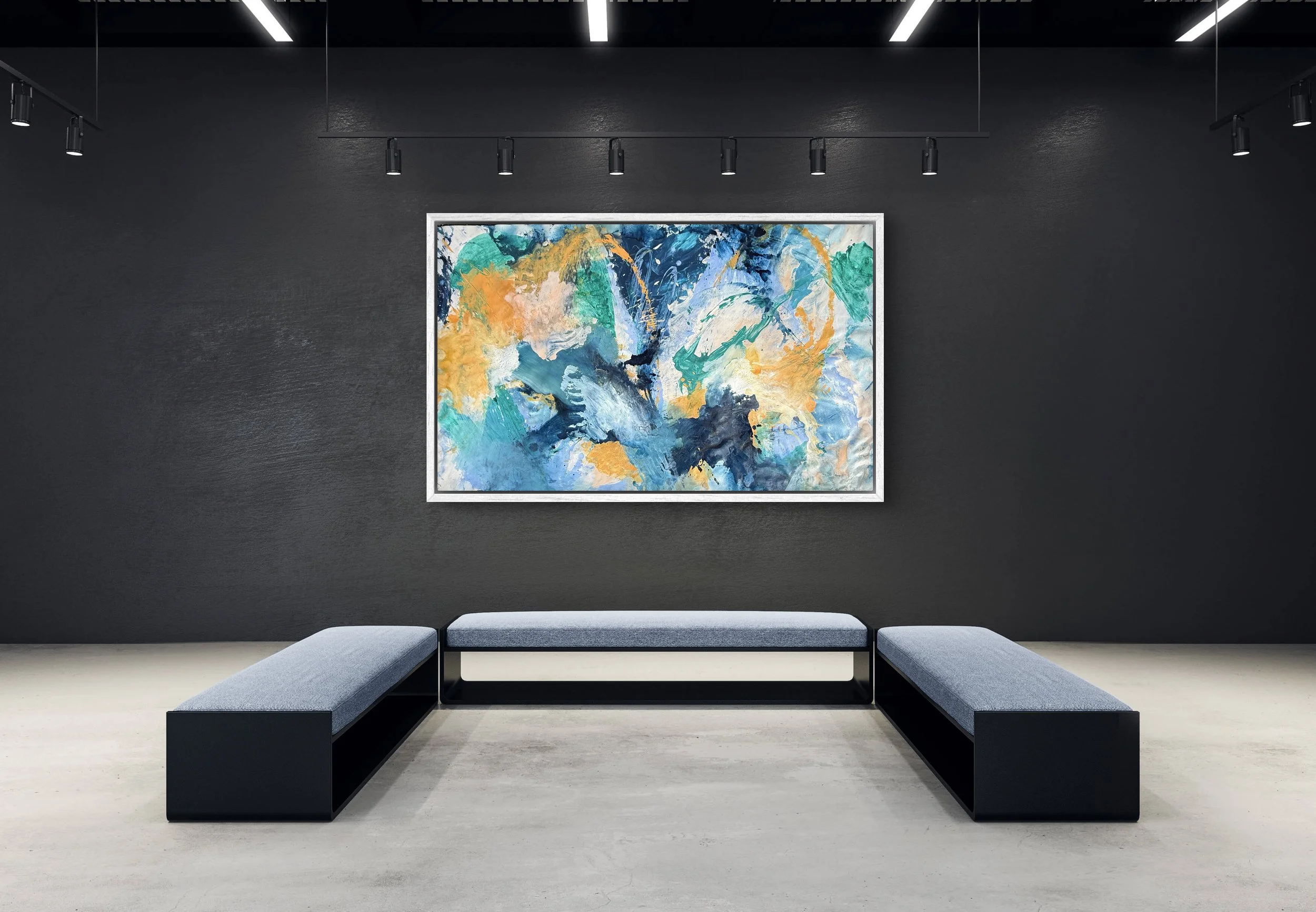 Bring your space to life with Beyond the Blue —a bold, expressive statement piece that sparks curiosity at every glance. Layers of vivid blues, energetic teals, and vibrant orange drift across the canvas in an interplay of motion and texture. This large-format artwork is perfect for a streamlined modern interior, gallery wall, or any environment where you want a pop of color and a touch of intrigue.